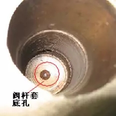為保證汽輪機打閘停機時能各汽門能夠快速關閉,油動機彈簧的作用力需通過閥桿端面可靠地傳遞至閥頭。設備廠家要求,閥桿裝配時需要著色檢查確認閥桿軸頭端面與閥桿套底孔接觸面積不小于80%,然后再裝配固定銷釘。但對閥桿脫落的汽門進行解體后發(fā)現(xiàn)閥桿套底孔并非平面而是一個弧面,如圖4所示,而閥桿軸頭端部為一平面,兩者的接觸為線接觸。最后確認,設備出廠前底孔用鉆頭加工后缺少銑平的工序,造成底孔為鉆頭加工后形成的圓弧面,造成閥桿軸頭與閥桿套底孔不是面接觸。在機組運行中,閥桿套底孔和閥桿軸頭由于線接觸受力而產(chǎn)生變形進而產(chǎn)生間隙,閥門關閉時彈簧巨大的沖擊力直接作用在連接螺紋和銷釘上,造成連接螺紋和銷子的損壞。