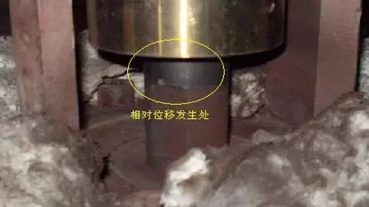 由此可見,在負荷與主蒸汽壓力差別不大的情況下,兩個時間的GV2開度差別較大,再結合前述試驗現(xiàn)象,重點懷疑GV2閥芯或閥桿已經(jīng)部分脫落。經(jīng)過現(xiàn)場仔細檢查確認,GV2閥芯與油動機聯(lián)接部位,閥桿與油動機已經(jīng)發(fā)生相對位移,如圖2所示。隨后,在將GV2關閉過程中,機組負荷沒明顯變化,但只能將其關到13%左右開度,無法再向下關。此時確認GV2閥桿與油動機聯(lián)接處銷子斷裂。