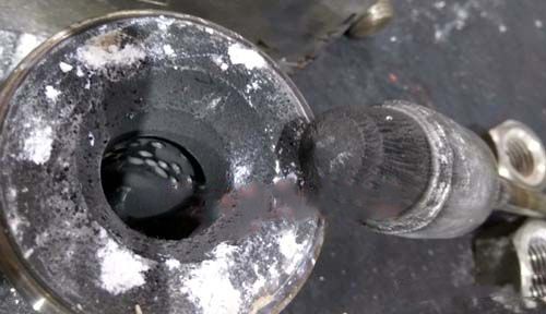 從拆開后的圖片分析,果然如我們所預計:閥門長期處于大壓差、高壓力環(huán)境下對閥芯座造成了汽蝕、沖蝕、磨損嚴重(出現(xiàn)了沖蝕條紋及蜂窩孔)。